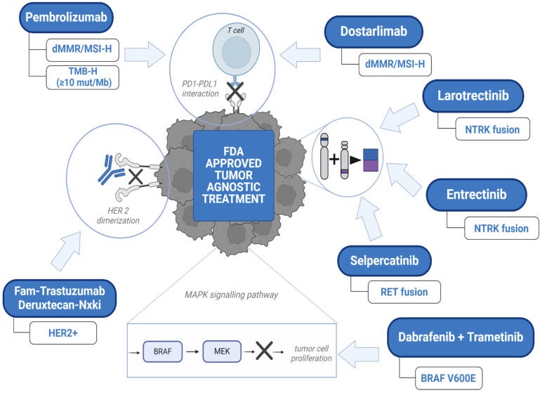 Today, the FDA has approved nine tissue-agnostic cancer therapies across different categories. Several of these are immunotherapies. The graphic above summarizes the current landscape. Key examples include: